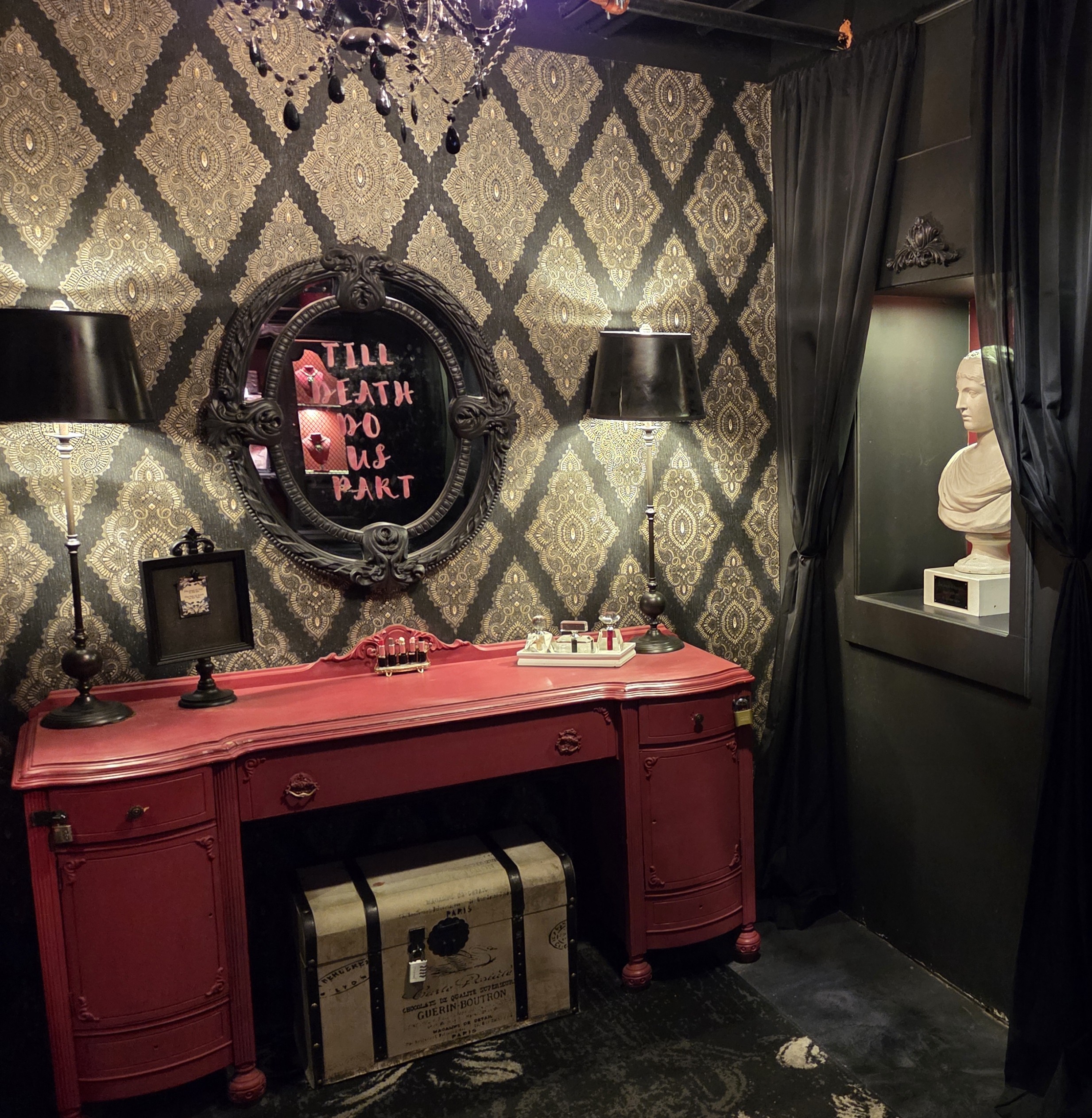Step into the lushly, if somewhat morbidly, decorated dressing room that Camilla has so helpfully temporarily vacated. She clearly has a dark, gothic aesthetic, as everything has an almost-creepy air to it.