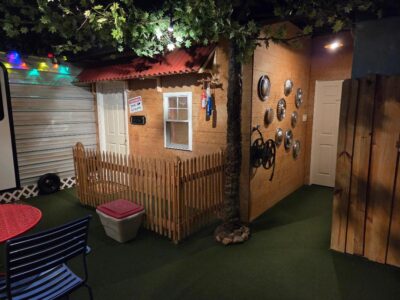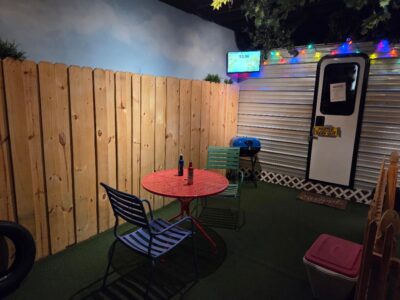 Bubba’s humble abode is the main focus. A garden shed sits opposite of Bubba’s trailer, while his house corners in his backyard into a cozy nook, perfect for grilling and relaxing.