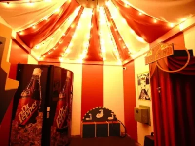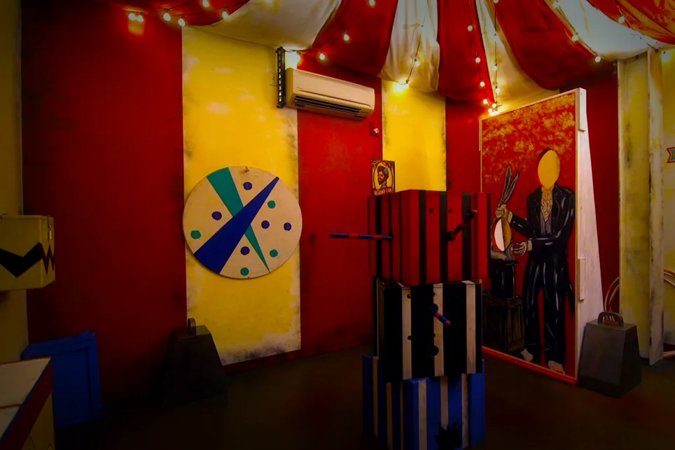 The circus big-top itself is a lofty space, with red and yellow stripes of fabric draped above, as well as surrounding, the abandoned performance ring. Equipment has been left behind by the performers- the strongman’s weights, the hoop dancer’s hula hoops, even items used by the clowns. Concessions are available from a popcorn cart and a soda vending machine, which hides its own secrets.