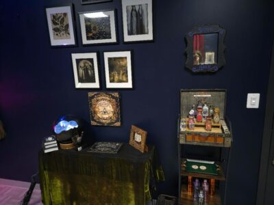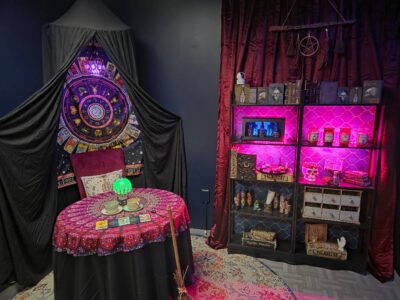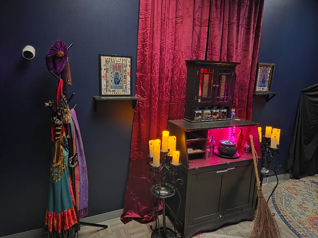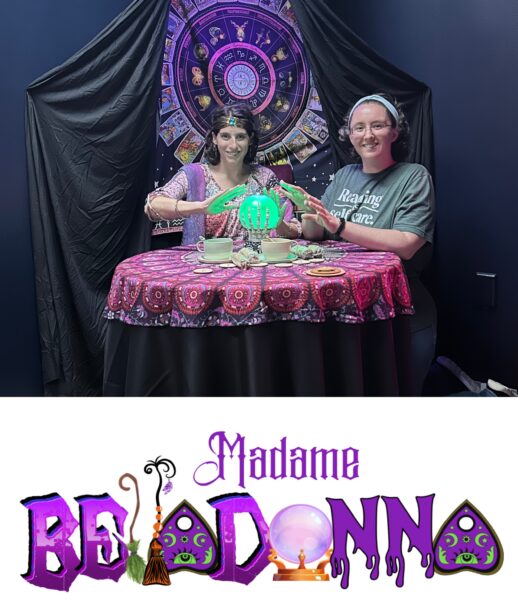 Everything occurs in Madame Belladonna’s seance parlor/divination chamber. Plain black walls are accented by deep red velvet curtains and a variety of mystic-themed posters. The corner where Madame Belladonna conducts her her readings is highlighted with a vibrant tapestry adorned with tarot cards, and a boldly-patterned tablecloth.