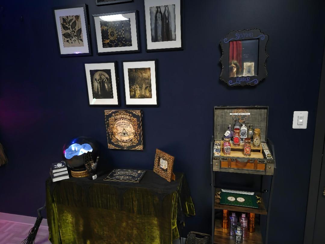 The space also doubles as an apothecary, as various herbs and potion ingredients are readily accessible. A rack full of pieces from Madame Belladonna’s wardrobe stands in the corner; perhaps she likes to have a spare costume around in case of potion spills. The atmosphere is further heightened through the crystal ball- it emits tinkling chimes, showing that the spirits are ready for us to make contact.
