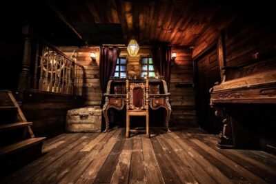 The Captain’s quarters have a bit more opulence, as a large window is framed by dark, heavy, velvety curtains. An intricately carved desk sits beside an upright piano, hinting at the Captain’s hobbies and enjoyments for when he is not off plundering and being an overall scallywag.