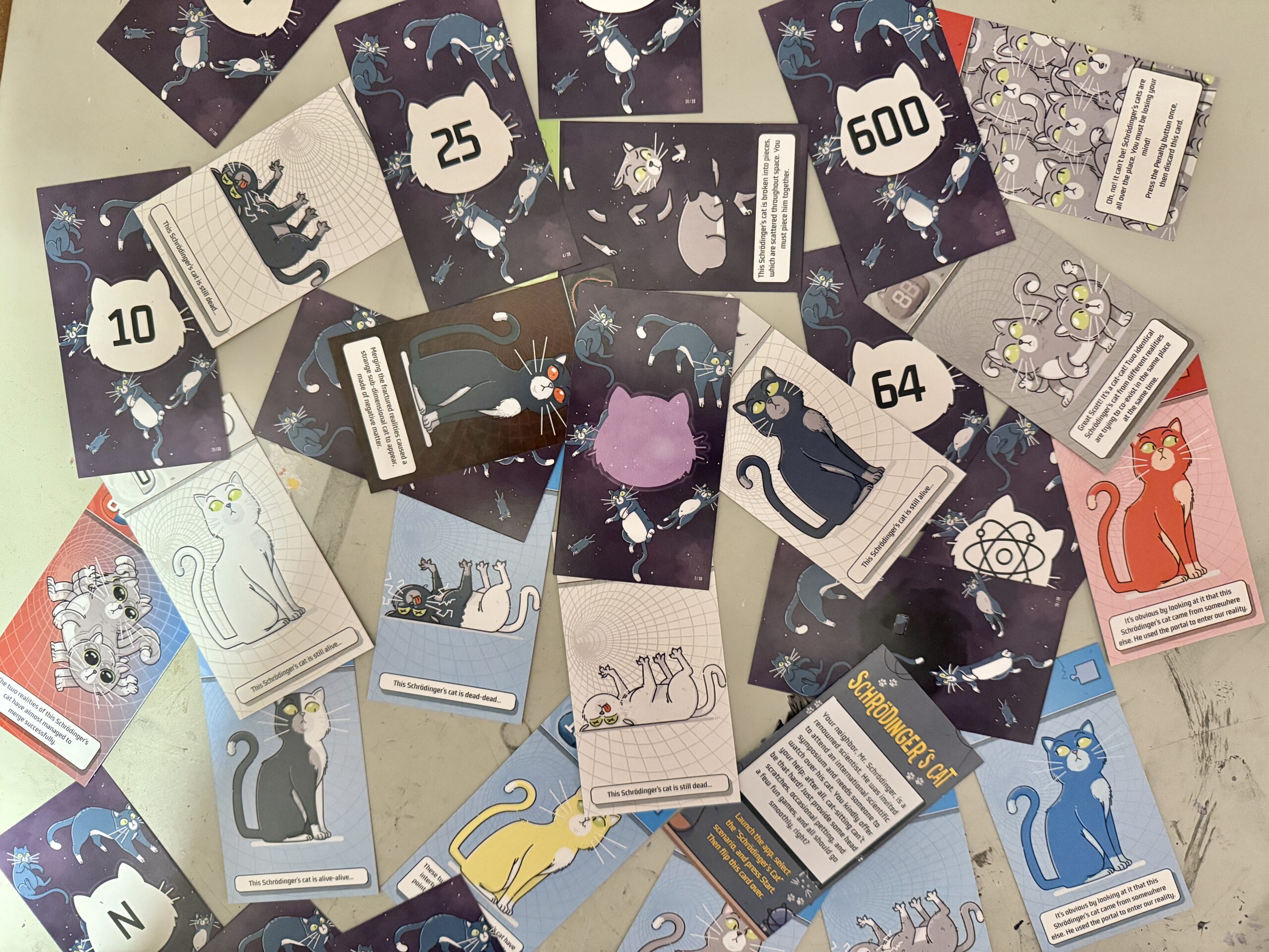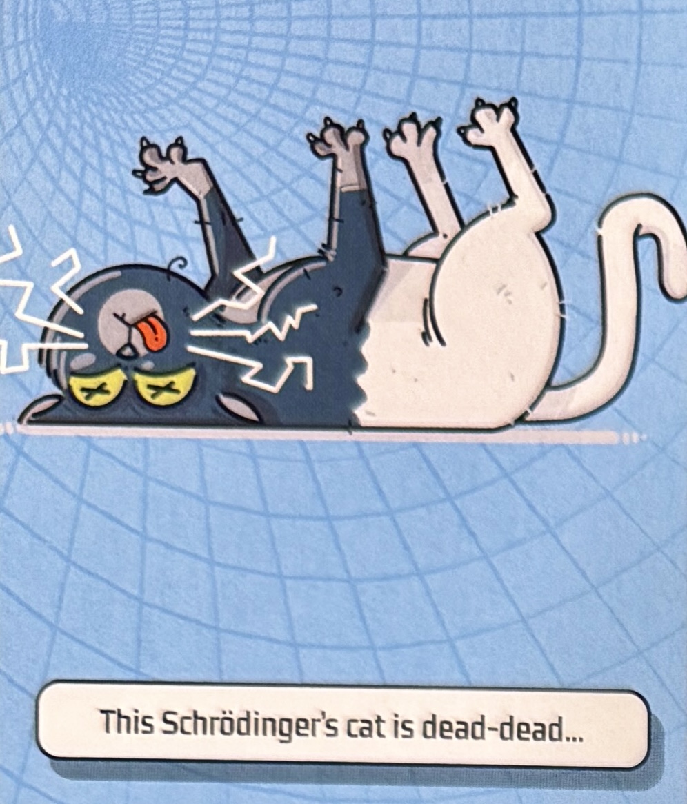 In this card-based game, Schrödinger’s Cat is an actual character whose misbehavior while his owner is out wrecks havoc, causing all sorts of quantum leaps that distort multiple realities. In real-life scientific theory, the term ‘Schrödinger’s Cat’ is a famous thought experiment that demonstrates the idea in quantum physics that tiny particles can be in two states at once until they’re observed. It asks you to imagine a cat in a box with a mechanism that might kill it. Until you look inside, the cat is both alive and dead at the same time.