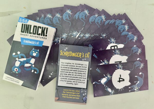 One of the things to love about Unlock! is their willingness to do wacky things that push the boundaries of imagination. Most of the times they work well to create very memorable At Home experiences. Schrödinger’s Cat is simply not one of those times. Interestingly, it’s what makes so many Unlock! games work that kills this one – trying to take ‘outside the box’ to the next level. In this particular deck, doing so results in a proverbial parade of logic leaps, one after another, leaving nothing but frustration in its litter box.