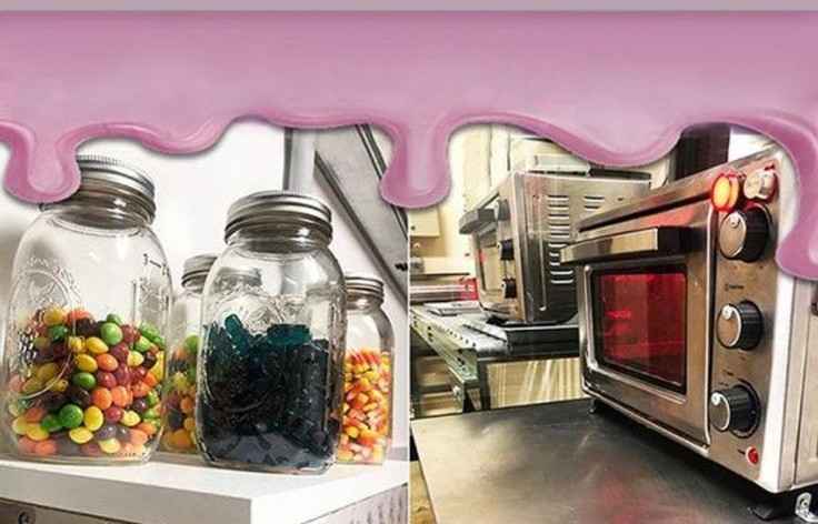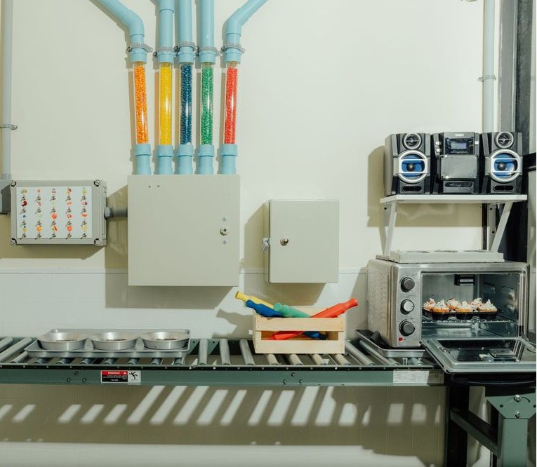 A small industrial-style kitchen is divided into two stations, with a glass and metal partition acting as separation between the “preparation” and “decoration” sections. The back half of the room, where all the preparation occurs, has the appearance of a farmhouse blended with a candy store, while the front half more resembles a true food factory.