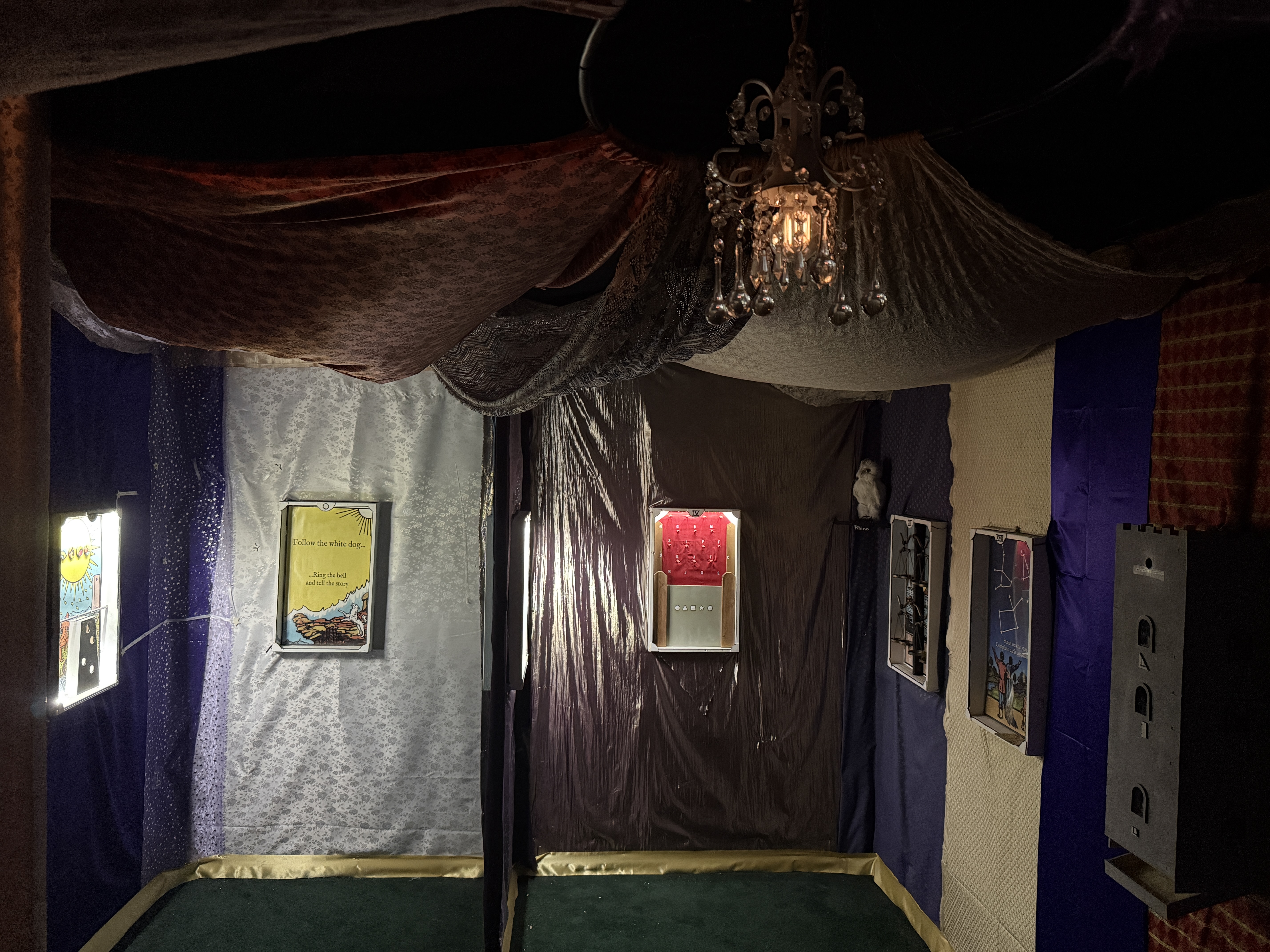 Brightly colored silk fabrics, some imprinted with fanciful patters and others trimmed by shiny gold tassels line each wall and hang draped up to the ceiling. This simple approach evokes the tone of a vintage fortune teller’s tent one might have encountered at an old-timey traveling circus.