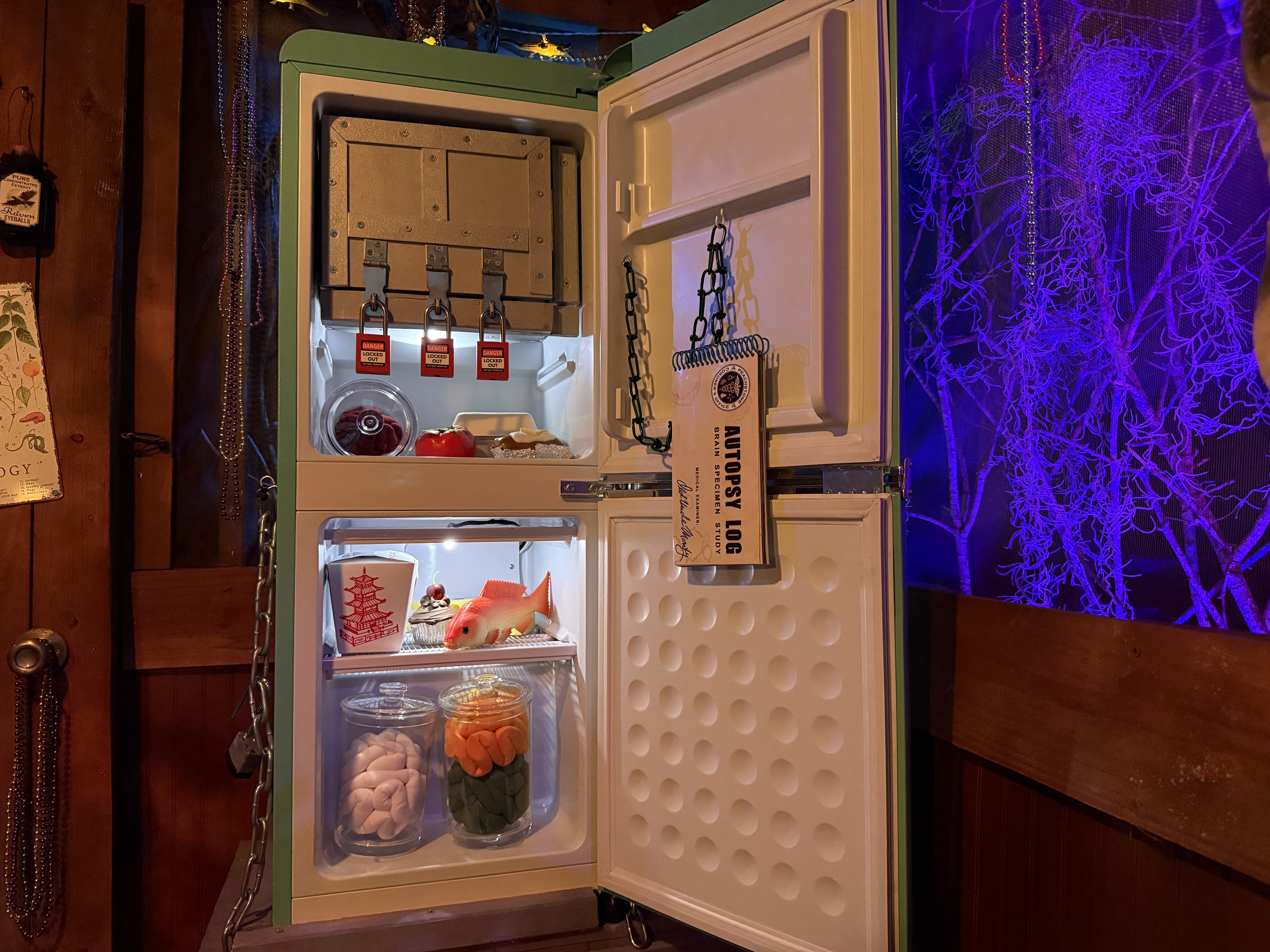 It would seem the Witch Doctor likes to make his customers feel right at home, because for some reason he left a refrigerator outside on the porch. (Those gators won’t be stealing a snack though; he keeps it chained up, of course.)