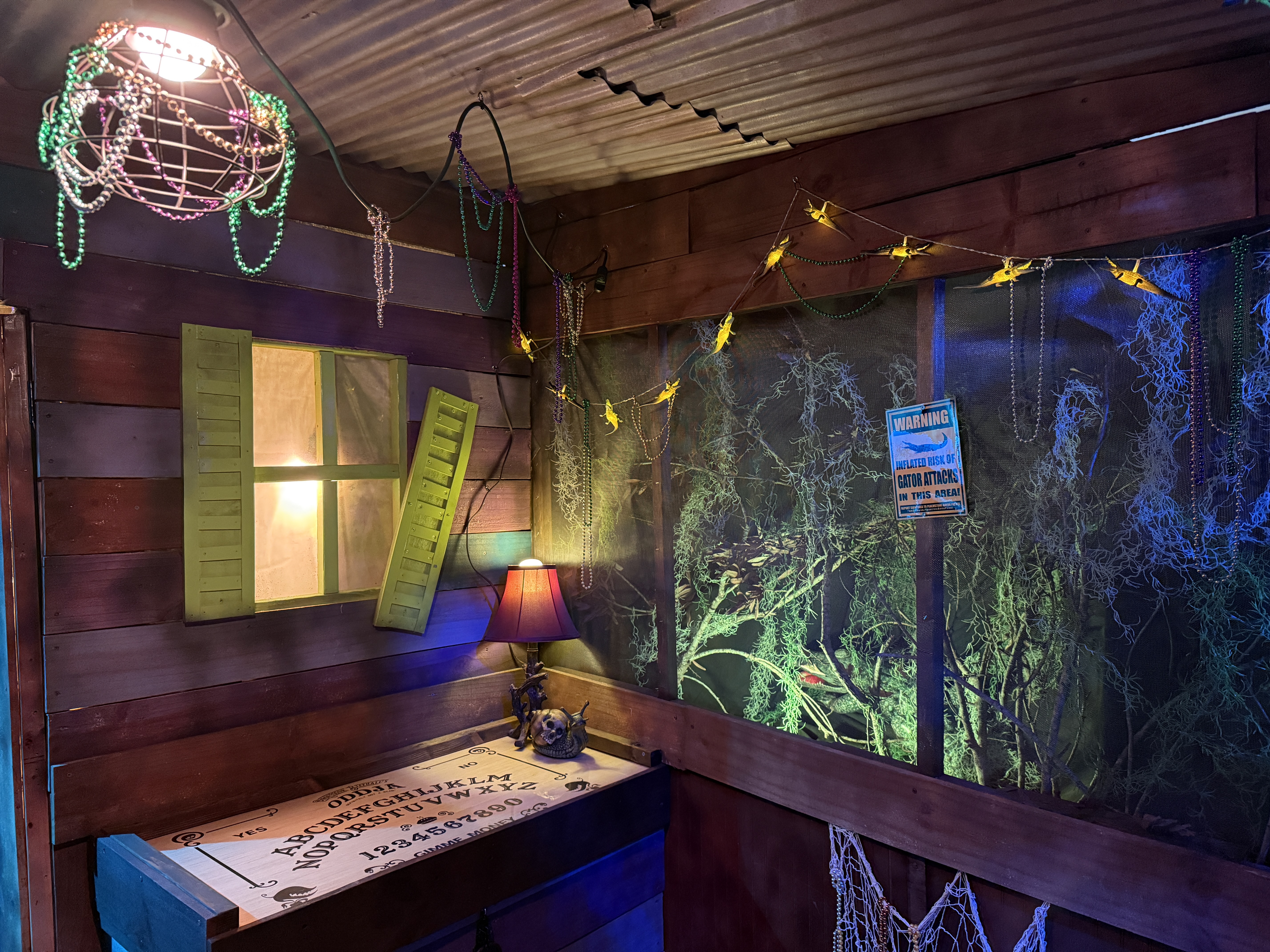 Just outside the shop-proper is a screened in front porch with views of the surrounding Peachstone Bayou. It has an enchanting glow under the moonlight (which can be seen thanks to a tree which recently crashed through the roof.) Despite the cozy appearance, it’s best not to go off the porch; after all, there’s always an inflated risk of gator attacks in the area!