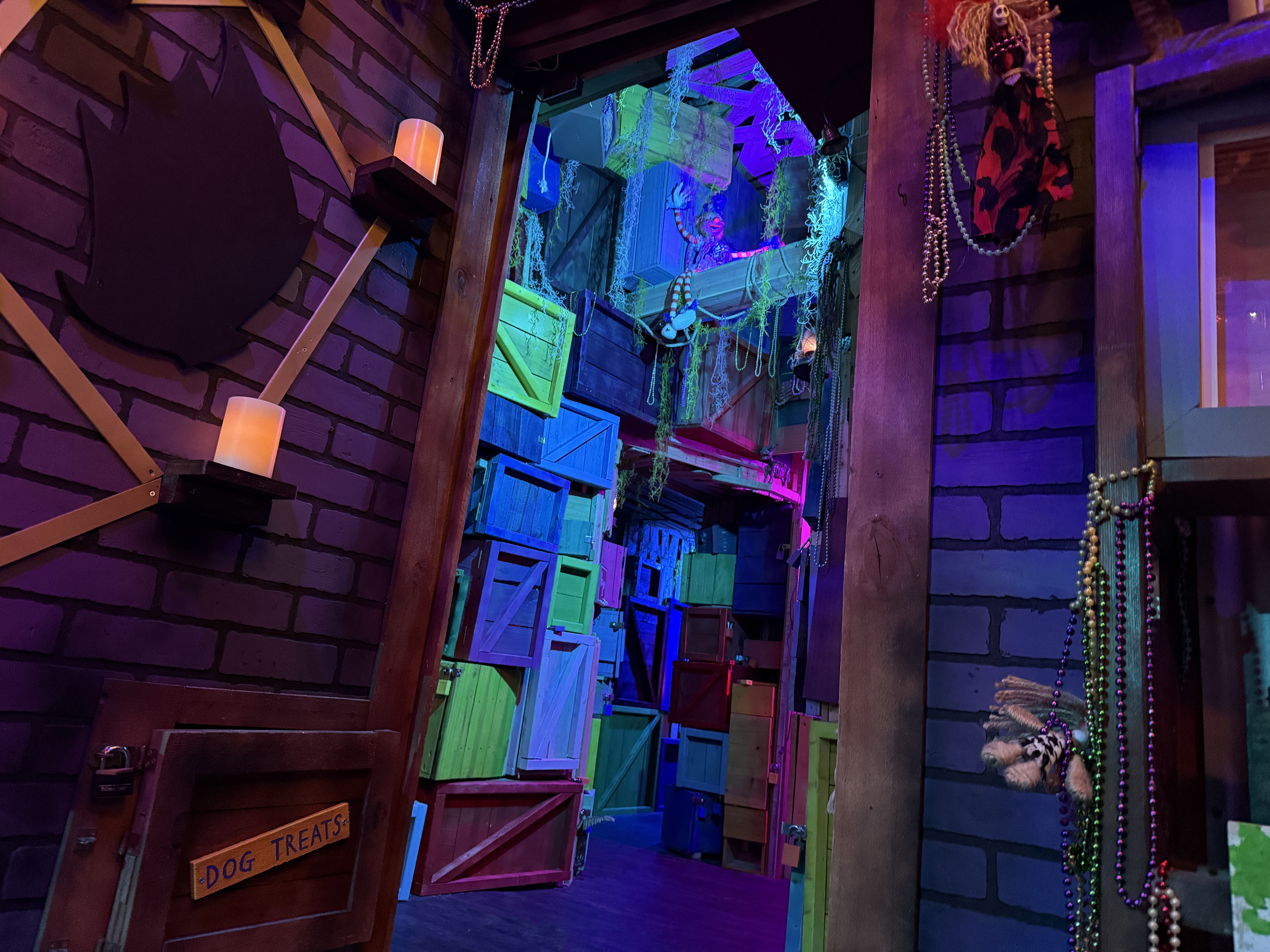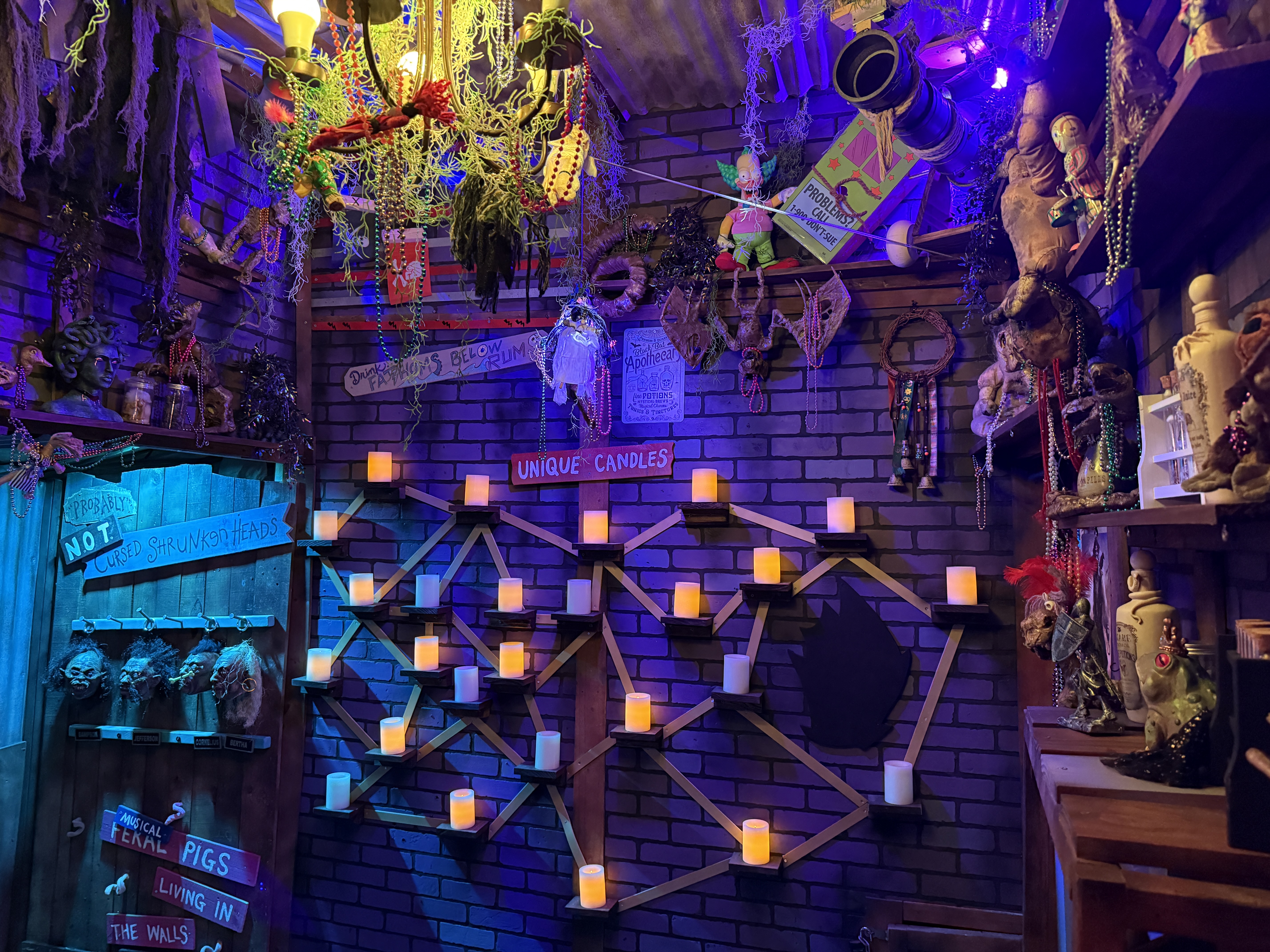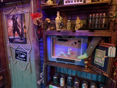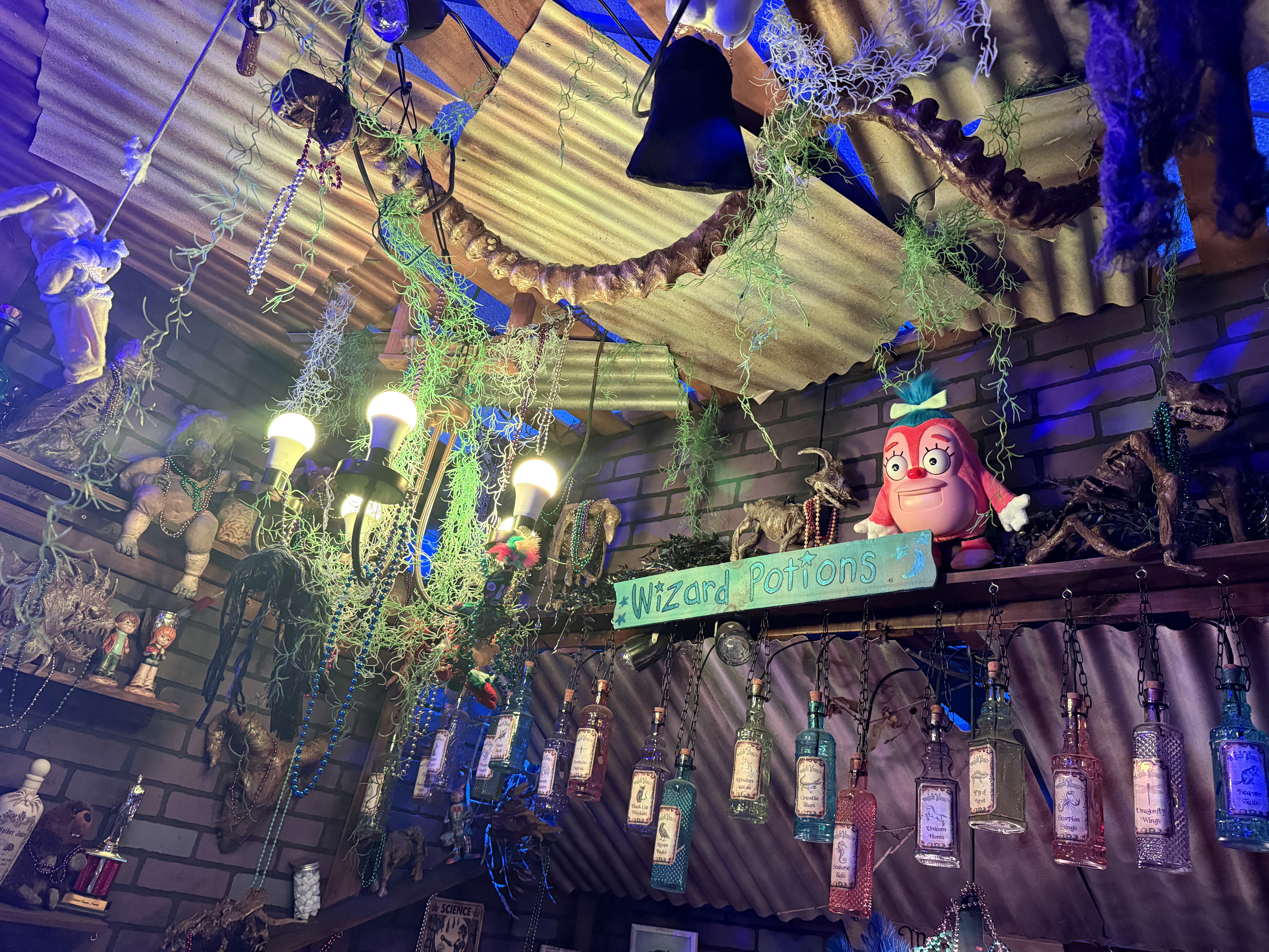 With the Witch Doctor away, the door into the customer area of his shop creaks open on its own, as if to welcome Helpers to their new job. Purple bricks of various shades line the walls, creating a slightly spooky but still cartoonish vibe. Dark wooden shelves surround the shop, each lined with bizarre artifacts, strange knickknacks and quite a few odd little (mostly mummified) animal corpses.  Hanging Spanish moss creeps through every slatted ceiling board, with even the rusted tin roof panels seeming to struggle to get the Louisiana Bayou to stay outside where it belongs. Sparkling Mardi Gras beads collect dust all around, adding a flare of colorful fun that lightens the mood while also reenforcing the Witch Doctor’s deep voodoo roots.