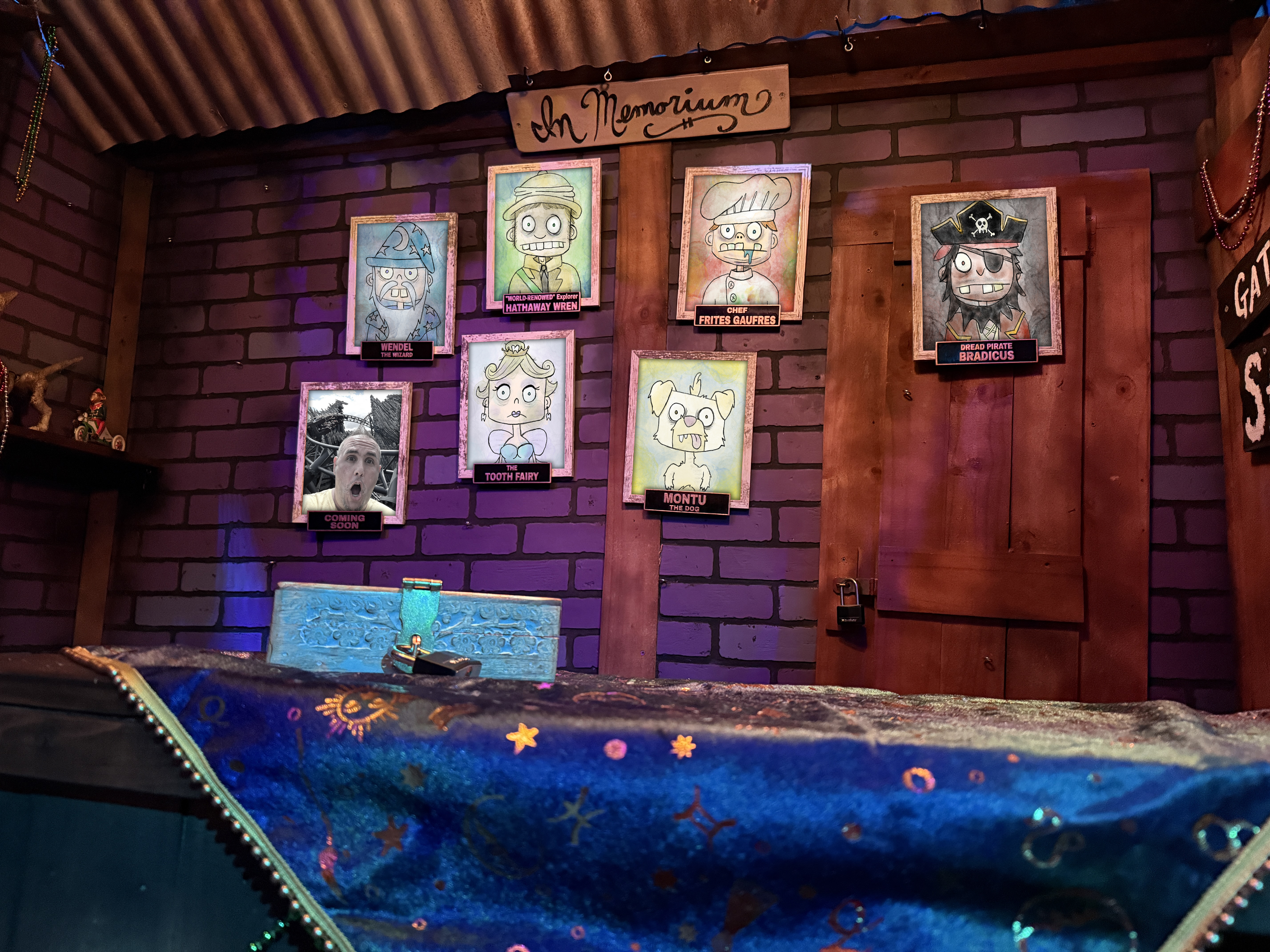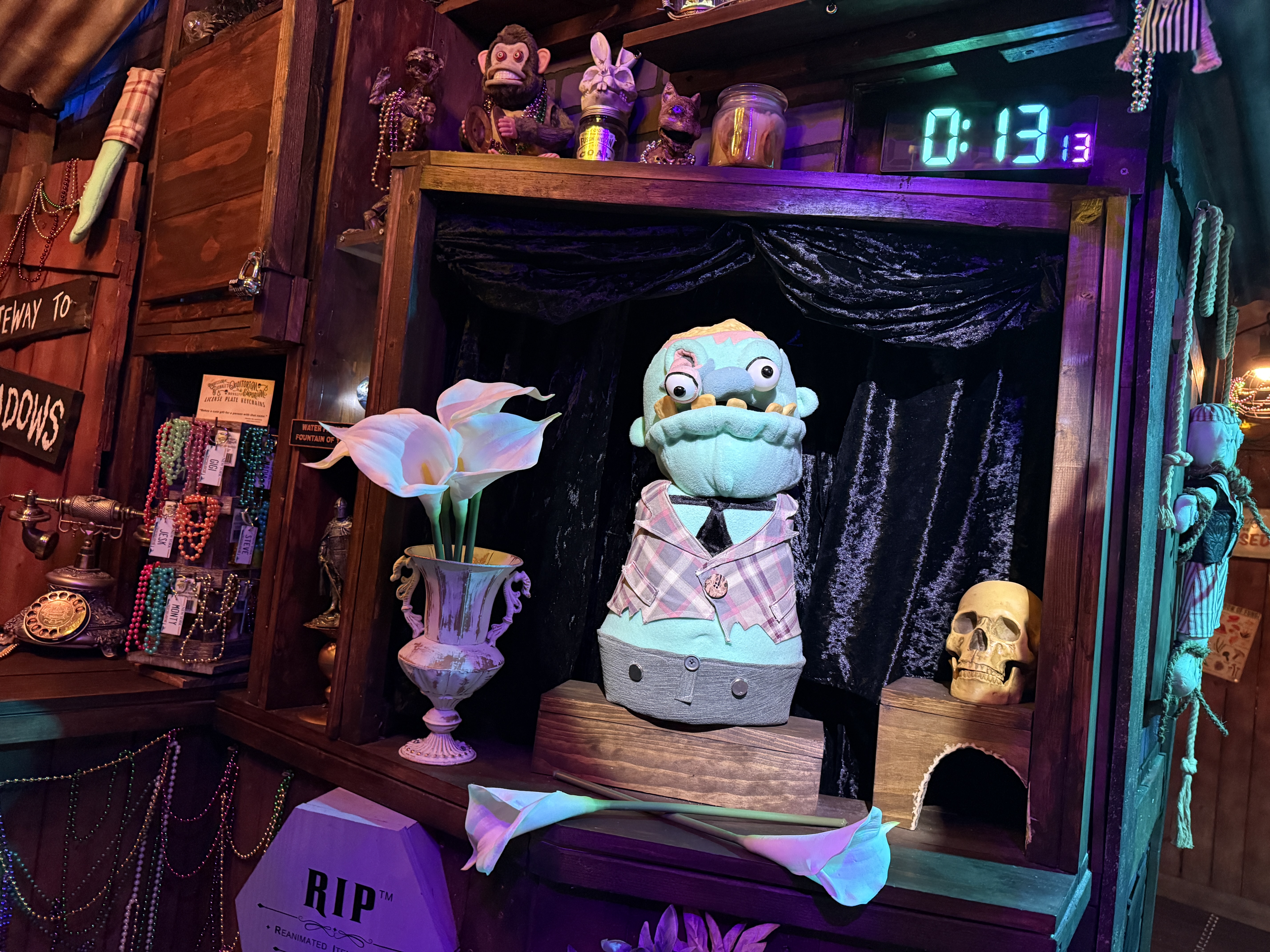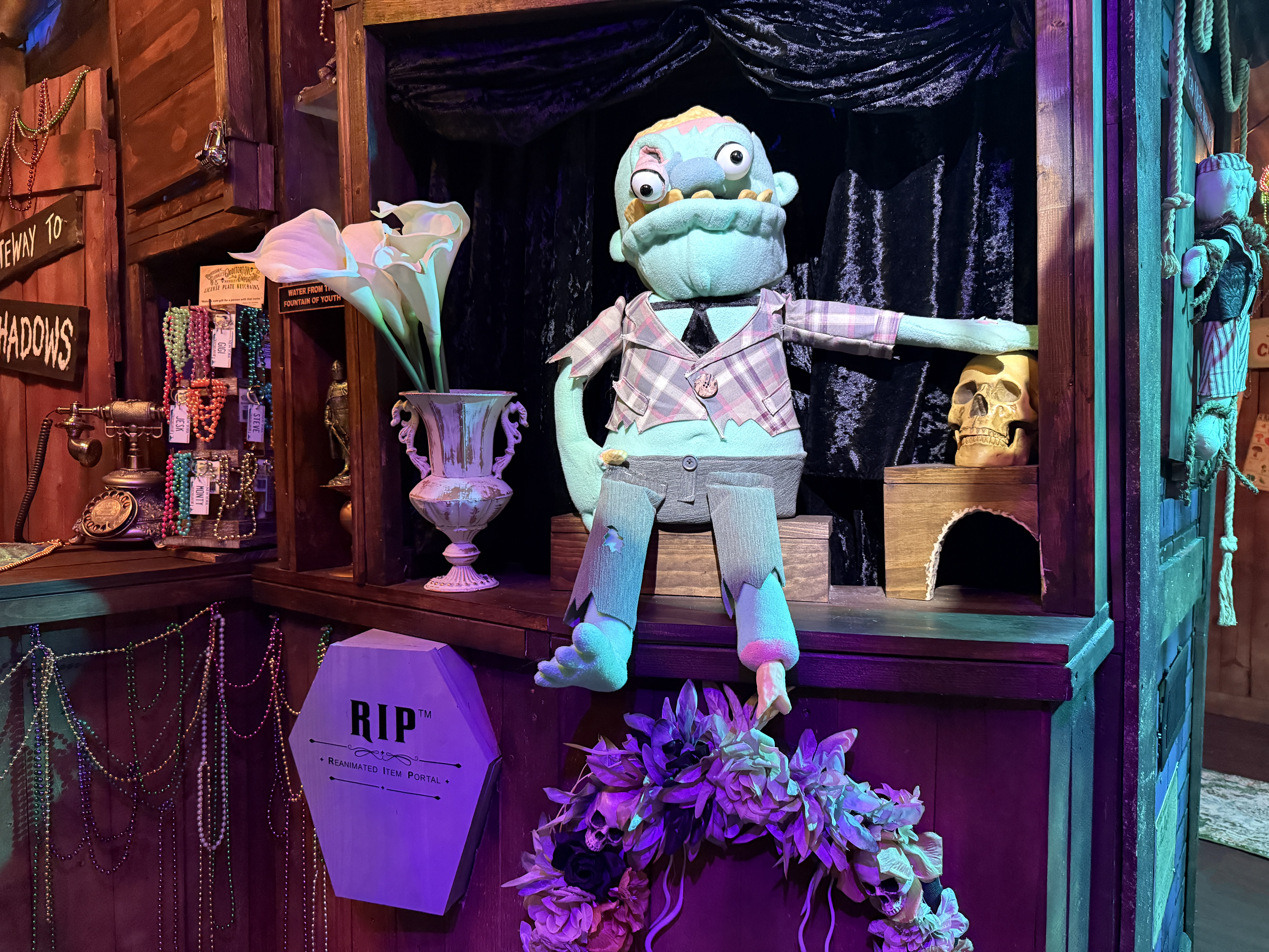 With the Witch Doctor away, the door into the customer area of his shop creaks open on its own, as if to welcome Helpers to their new job. Purple bricks of various shades line the walls, creating a slightly spooky but still cartoonish vibe. Dark wooden shelves surround the shop, each lined with bizarre artifacts, strange knickknacks and quite a few odd little (mostly mummified) animal corpses.  Hanging Spanish moss creeps through every slatted ceiling board, with even the rusted tin roof panels seeming to struggle to get the Louisiana Bayou to stay outside where it belongs. Sparkling Mardi Gras beads collect dust all around, adding a flare of colorful fun that lightens the mood while also reenforcing the Witch Doctor’s deep voodoo roots.